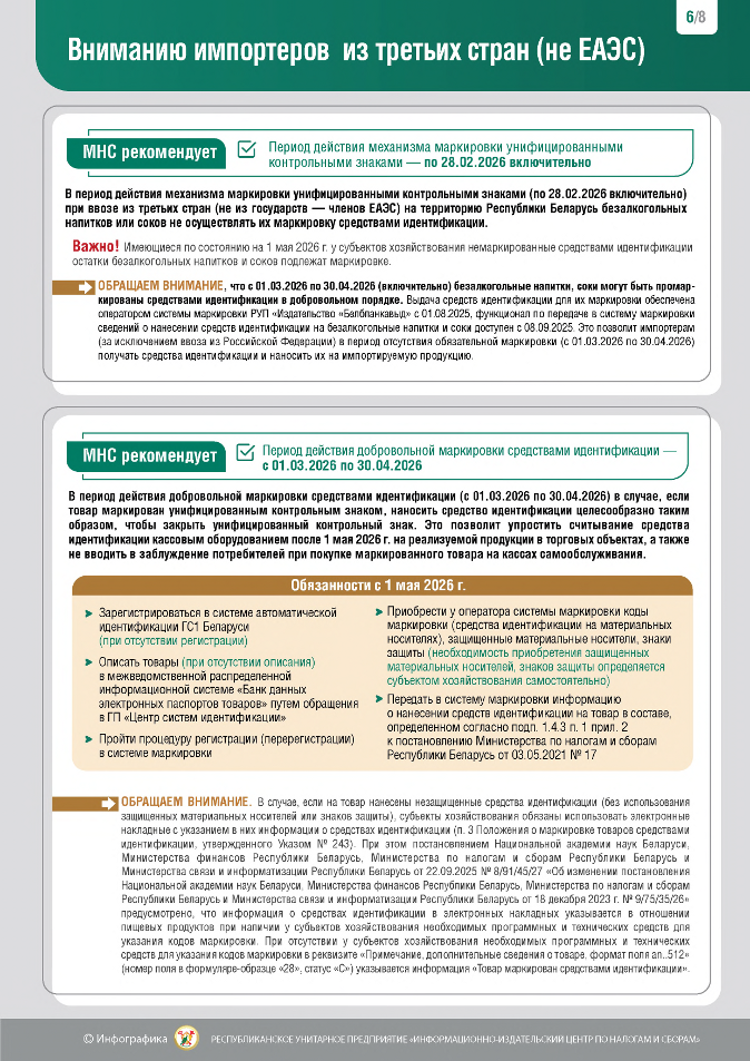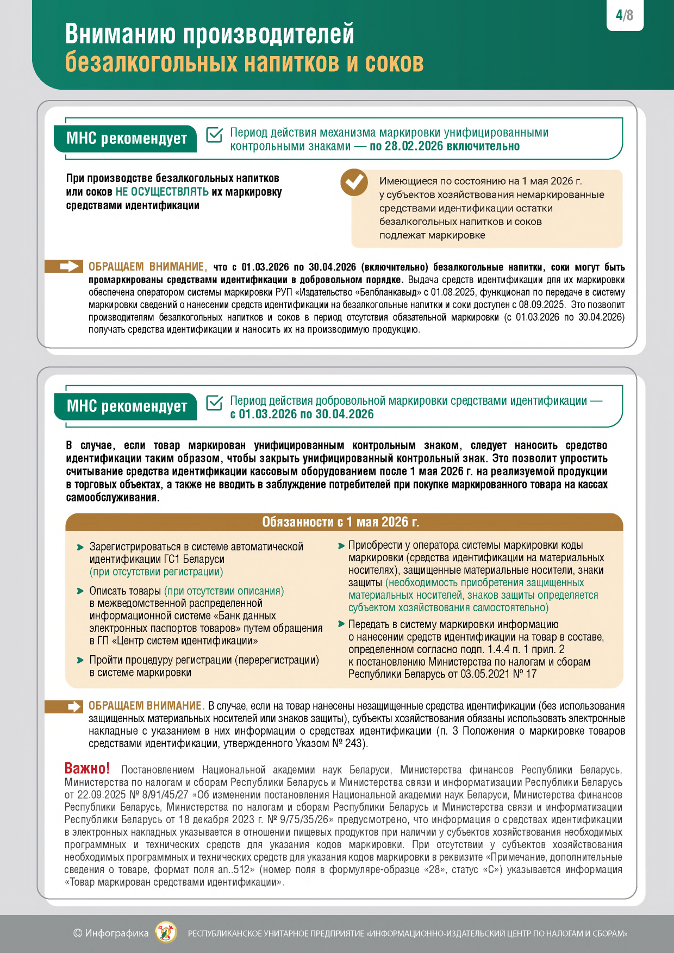 Министерство по налогам и сборам обращает внимание, что в связи с принятием постановления Совета Министров Республики Беларусь от 30.12.2025 № 795 ”Об изменении постановлений Совета Министров Республики Беларусь“ (далее – постановление № 795) с 12 января 2026 г. возобновляется маркировка унифицированными контрольными знаками безалкогольных напитков, которая временно была отменена с 1 октября 2025 г.