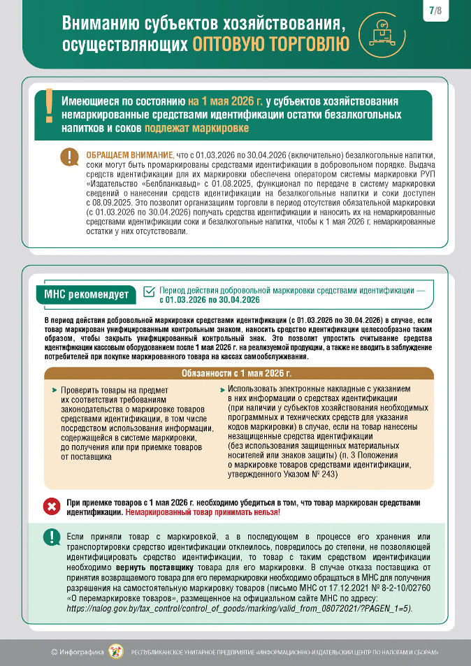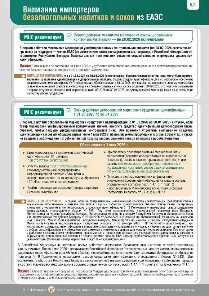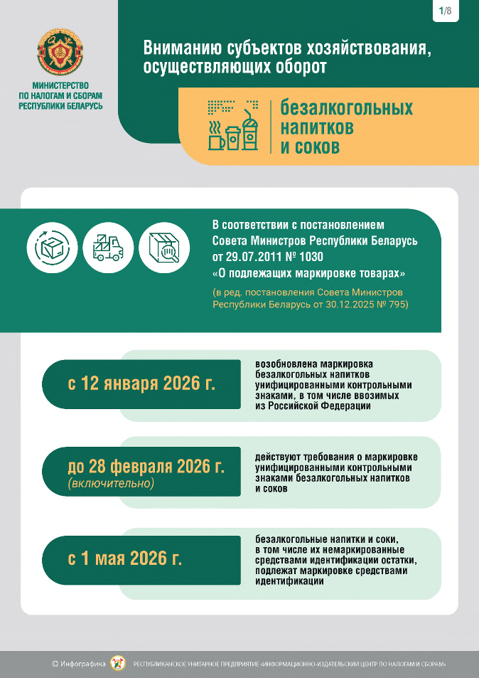 Министерство по налогам и сборам обращает внимание, что в связи с принятием постановления Совета Министров Республики Беларусь от 30.12.2025 № 795 ”Об изменении постановлений Совета Министров Республики Беларусь“ (далее – постановление № 795) с 12 января 2026 г. возобновляется маркировка унифицированными контрольными знаками безалкогольных напитков, которая временно была отменена с 1 октября 2025 г.