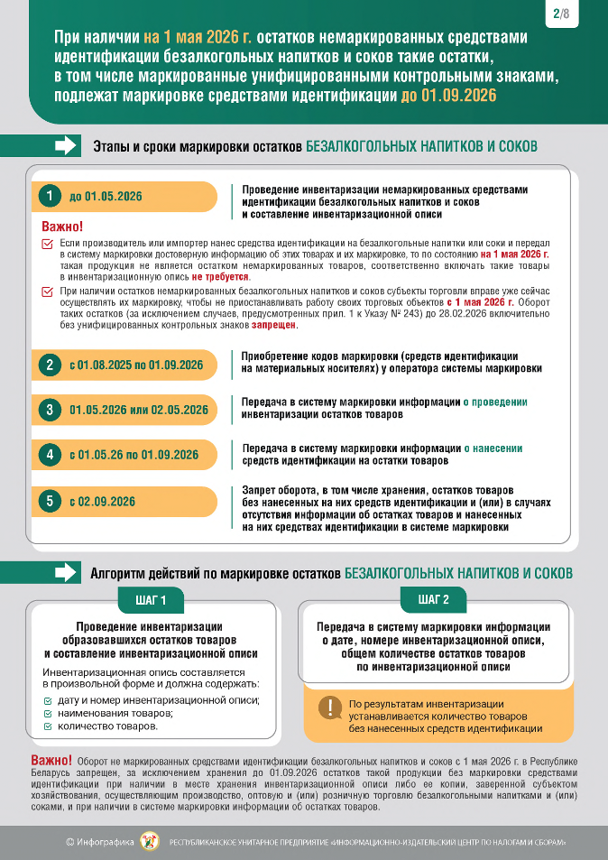 При наличии на 1 мая 2026 г. остатков немаркированных средствами идентификации безалкогольных напитков и соков – такие остатки, в том числе маркированные унифицированными контрольными знаками, подлежат маркировке средствами идентификации до 1 сентября 2026 г.