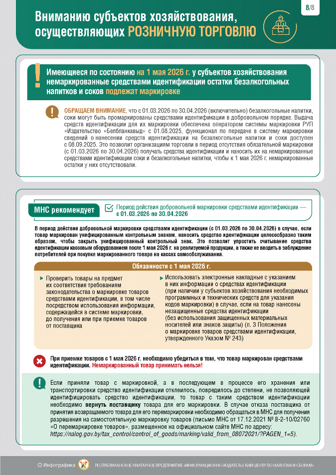 с 1 мая 2026 г. безалкогольные напитки и соки, в том числе их немаркированные средствами идентификации остатки, подлежат маркировке средствами идентификации.