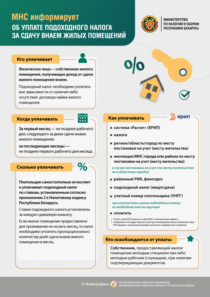 Ставка подоходного налога с физических лиц в фиксированных суммах для физических лиц, сдающих жилые помещения в г. Бресте, с 1 февраля 2024 года составит 44 рубля в месяц за каждую сдаваемую комнату; в г. Барановичи, г. Пинске и г. Кобрине – 29 рублей; в иных городах районного подчинения и поселках городского типа – 21 рубль, в иных населенных пунктах и территориях – 15 рублей.